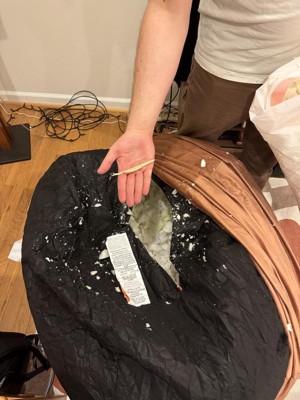 I just received mine. It was too full for my liking, so I opened and removed some of the polyurethane foam. FirstLu, the tiny foam dust gets everywhere, and I don’t think it’s safe to breathe in. Secondly, I found a 3-inch WOOD SPLINTER inside. Glad I didn’t sit on that and get impaled.