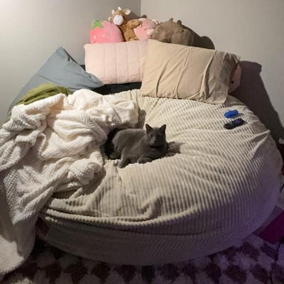 Absolutely massive. Super comfy, love the memory foam rather than beans/beads. Makes me feel better about my cat on the bag in case of a hole. The bag cover is a pretty saggy but that made it easier to get the cover on the bag. But the cover is so soft and the color is the perfect neutral I needed for my reading nook. Either way I’d absolutely buy this again, best purchase I made this year!!