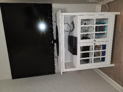 This TV stand was well packaged and easy to assemble. It looks fantastic and has the storage we needed for our kids game console, games and associated gadgets. Don't panic when you put the doors on and they appear to be too far apart. Finish the assembly, then adjust the hinges. This took a little loosening/tightening to get it how I wanted, but it was not a difficult task.