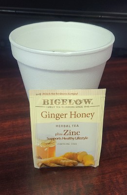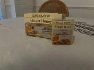 [This review was collected as part of a promotion.] I was very happy to receive this product from Bigelow through the Bzz Agent program. I received this product for free in exchange for writing this review but my entire review is truthful and honest, identifying both positives and negatives of the product for you to come to your own conclusion on whether this product is right for you. I am a big tea drinker and often like to try new teas when they come out. Bigelow is the classic tea maker so I was excited to try this ginger honey tea. The first thing I noticed when steeping this tea was the delicious aroma of ginger and honey that engulfs you. The taste of the tea is delicious too, a mild ginger flavor with subtle honey that feels nice on your throat as it is swallowed. Although I didn't have a cold at the time I tried this, this will definitely be my 'go to' when I am sick as it opens my airways, feels great on my throat and also has Zinc in it which has been shown to shorten colds by a day if started within 24 hours of symptoms onset!