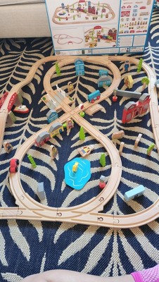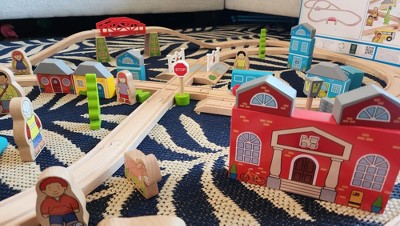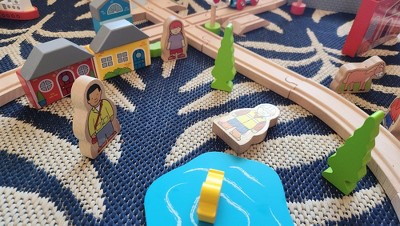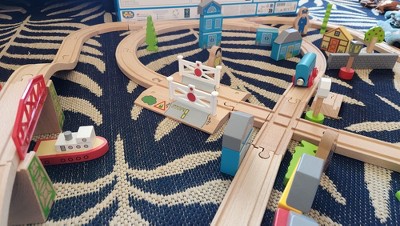Bright young minds can enjoy the best of both worlds with this wooden Town and Country Train Set! From the town station, take a ride to the country store, through the woodland and out to the river before returning home again. Wooden houses, cars, town and country folk plus a level crossing, and a boat will keep young minds entertained with endless play scenarios. Consists of 101 play pieces. Assembled dimensions are 40.15 inches wide and 29.92 inches deep.