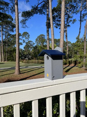 [This review was collected as part of a promotion.] I really like this bluebird house. The material is sturdy, should hold up really well to the weather elements, and it seems like it would be very easy to clean. The box seems to be well fitted together and feels solid. I like that there are lines cut under the door make to make it easier for baby birds to climb in and out. I've had to tack a piece of screen to my wooden bluebird houses in the past, so this was a nice touch. Nesting season has not started here yet. I've got another few weeks at least, but I have seen bluebirds stopping by to check out the new house, so hopefully I'll have a couple of new residents soon.