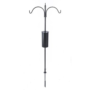 Complete feeder pole set to hang two bird feeders. Includes a 3-section heavy duty 16 gauge wall, 1" diameter black steel tubing, a ground twister that twists into the ground 20" and has a set screw along with 1/2" turning holes, a black 14-1/2" cylindrical squirrel baffle and a wire 2 arm 3/8" round black steel pole topper with finial. Pole is 60", topper goes on top section of pole.