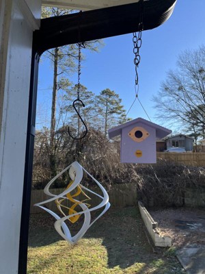 This design is what I was looking for because the front roof extends out over the opening to protect the birds inside from rain, wind & sun. Other birdhouses do not have that roof extension. Within a day or two, the birds moved in. It is hanging in a secure location on a Shepard's hook. I chose the natural color based on what I read about avoiding bright white & too colorful birdhouses & it must be true, because the birds took to it right away. It's very cute too. It blends in with the tree. Thank you for a great product design.