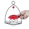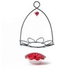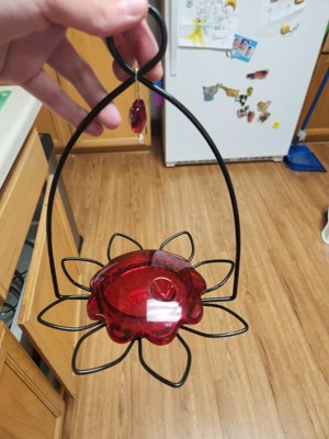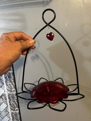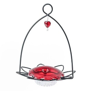 Birds Choice Hummingbird Flower Feeder will provide nectar. The elegant Flower shaped feeder comes with an ornamental dangling heart. This hummingbird feeder has a black powder coated steel heart shaped hanger for long lasting use, even outside in the elements. Comes with a durable, removable red polycarbonate cover and clear 3 oz. feeding cup. Say goodbye to unwanted pests invading your nectar. This hummingbird heart feeder includes a removable nectar cup cover with a restrictive nectar port designed to keep bees and wasps out.