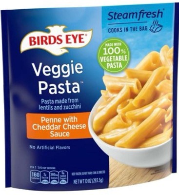 Enjoy savory sides without the hassle with Birds Eye Veggie Pasta Penne with Cheddar Cheese Sauce. Birds Eye Veggie Pasta lets you enjoy one of your favorite comfort foods with a boost of veggies. Traditional penne pasta is replaced with 100% vegetable pasta made from zucchini and lentils and is covered in a rich cheddar cheese sauce that's made with real cheese for a delicious frozen vegetable side everyone will love. Each serving of lentil and zucchini noodles provides 1/2 cup of vegetables, and this veggie pasta side is made with no artificial flavors for a delicious way to enjoy frozen sides without compromise. Serve this frozen side dish with your favorite meals, or add sausage, ground beef, pulled pork or other meat options to the penne pasta to make it a meal. Easily prepare the zucchini and lentil pasta in a saucepan on the stove in under 8 minutes or cook it in the microwave in less than 5 minutes with a 1 to 2 minute standing time. Store this 10 ounce bag of pasta sides in the freezer until you are ready to enjoy. It’s good to eat vegetables, so Birds Eye makes vegetables good to eat.