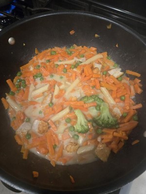 Tastes good, but too many carrots. Half the bag is carrots. I’ve never had carrots with any Chicken Alfredo before.