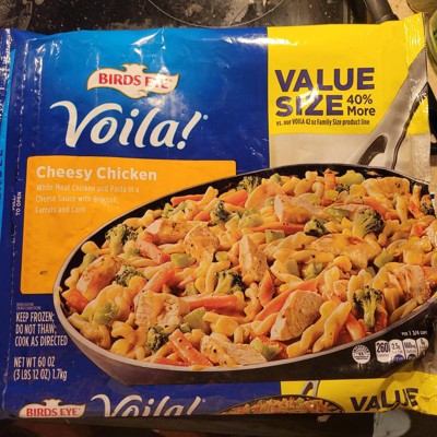 Hi. Thank you for taking the time to reach out to us. We're sorry your experience with our Birds Eye Voila Cheesy Chicken wasn't satisfactory. We'll make sure your feedback is shared with our team. We hope you'll give us another chance and try some of our other products. Thanks again for your comments.