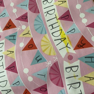 A: The theme of the wrapping paper is floral with a happy birthday banner design.