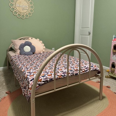 The simple yet stylish lines of the arched head and foot board make the Brooklyn Metal Twin Bed a perfect fit in any bedroom. It's available in a variety of classy finished colors; Black, White, Blue, Red, Gray, Turquoise, and Pink. This kid's metal bed can serve as a fashionable backdrop for any designer's imagination. The solid steel construction of this twin bed makes it a durable choice for your child's bedroom. The woven mattress support means this steel bed for kids does not require a box spring or Bunkie board. Pair this twin metal bed frame with a mattress and sheets that match your decor to complete the look. This bed is big enough to give a cozy and comfortable night's sleep to your child. It is designed for use with a child ages 4 years and older. With a durable finish it is easy to clean and maintain. The Brooklyn Metal Twin Bed is a must-have for your child's bedroom.