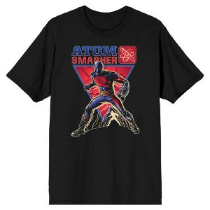 • GRAPHIC TEE: Atom Smasher uses his powers to grow in size in the graphic design on this tee while a red triangle appears in the background. The hero's name is spelled out in red and blue letters above the image.