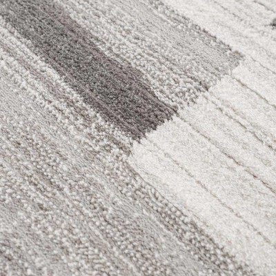 A: The rug features a geometric design in black and ivory, adding visual interest to your space.