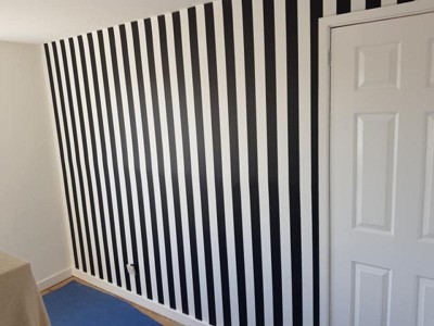 A full roll of this product is 20.5 inches wide and 396 inches long. A full roll can cover up to 56 square feet depending on the design match and pattern repeat. A sample of this product is 8 inches by 11 inches. This classic black and white striped wallpaper is a sleek and stylish way to decorate your walls, perfect for all the family. The bold pattern coordinates perfectly with our Dotty striped design also in black and white. The smooth finish of this paper is best applied to a smooth surface for a clean, professional look. Offers a smooth, untextured finish. Free match with no pattern repeat.