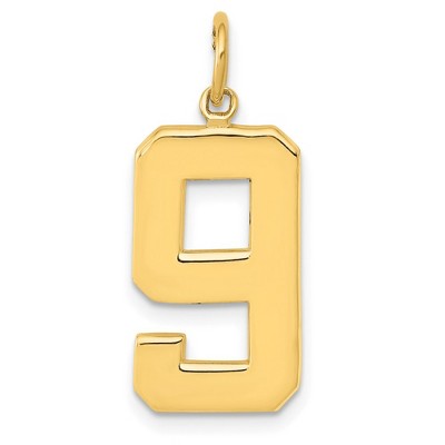 Celebrate your favorite sports player, lucky number or milestone date in your life with a prominent 14k yellow gold charm. This polished number is approximately 18mm (11/16 inch) in length and is finished with a classic jump ring that will accommodate up to a 3mm chain. Made in the U.S.A. Chain not included. Additional features include: solid 14k yellow gold design; features a flat design with a high polished finish; approximately length 18mm; average weight is 1.31 grams.