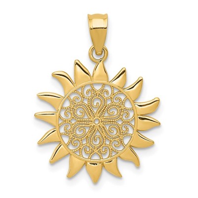 Marine life treasures, beautiful and bizarre creatures of the vast seas artistically sculpted in 14k yellow gold. This two-dimensional fish features a textured filigree design with a high polished finish that is approximately 17mm (5/8 Inch) in width by 25mm (1 Inch) in length, which includes the tapered bail. Made in the U.S.A. Chain not included. Additional features include: solid 14k yellow gold design; high polished finish; approximate size is 17 x 25mm with the bail; average weight is 0.97 grams.