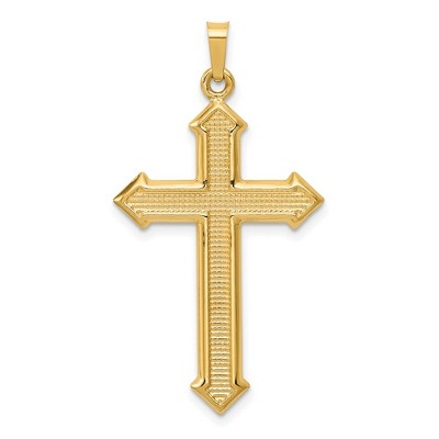 Celebrate and honor all special occasions with jewelry of religious significance! Our collection of spiritually inspired designs that show faith, hope and devotion are perfect for commemorating life's milestones. This polished passion cross pendant available in 14k yellow or white gold features a hollow, 2-dimensional, flat back design. The approximate size is 22mm (7/8 inch) in width by 42mm (1 5/8 inch) in length with the bail. This item does not include a chain. Additional features include: available in 14k yellow or white gold; features a hollow, 2d, flat back design; approximate size is 22mm in width x 42mm in length; chain not included.