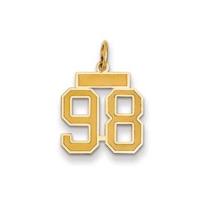 Celebrate your favorite sports player, lucky number or milestone date in your life with a prominent 14k yellow gold charm. Each laser-cut satin and polished number is approximately 12mm (7/16 Inch) in length, which is finished with a 3mm top bar and classic jump ring that will accommodate up to a 3mm chain. Made in the U.S.A. Chain not included. Additional features include: crafted from solid 14k yellow gold; laser-cut flat design with a satin and polished finish; approximate length 15mm; average weight is 1.25 grams.