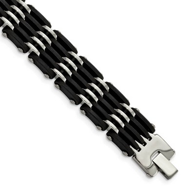 Change up your look with this stainless steel and two-tone leather bracelet featuring a black and blue fancy braided design. It is approximately 15mm (9/16 inch) in width by 8.25 inches in length include the magnetic clasp. Additional features include: crafted in stainless steel, black & blue leather; features a two-tone fancy braided design; approximate size is 15mm width x 8.25 in length; average item weight is 25.97 grams.
