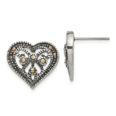 An antiqued butterfly featuring an intricate milgrain and jeweled design fashioned from stainless steel and faceted marcasite combines an old-world style with a contemporary flair. This friction-back post earring measures approximately 17mm (5/8 inch) in width by 15mm (9/16 inch) in length. Additional features include: antiqued stainless steel design; accented with faceted marcasite stones; approximate size 17 x 15mm; weight is approximately 9.5 grams.