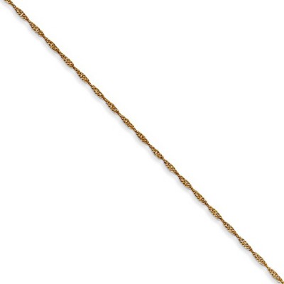 Indulge in the luxury of 14k yellow gold with this delicate 1mm width, nickel free, Singapore chain. It closes with a spring ring clasp and the twist style design will compliment your yellow gold charm or pendant to perfection. Additional features include: polished, nickel free, 14k yellow gold design; solid link, 1mm width, classic singapore style; closes with a lobster claw clasp; average weight for the 18-inch length is 1.2 grams.