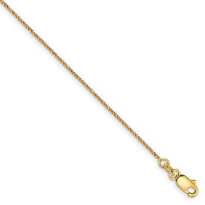 This beautiful chain intricately woven from 14k yellow gold features a solid link, Parisian wheat pattern with a smooth polished finish. Crafted in the USA, this 1mm width anklet chain comes complete with a lobster-claw clasp for a reliable fit. Additional features include: crafted with 14k yellow gold; 1 mm in width; wheat style chain; closes with a lobster claw clasp.