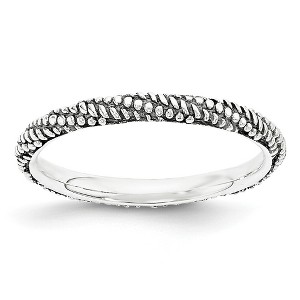 Make it simple and stylish with stackable bands of different textures, finishes, widths and colors! This sterling silver band features a textured design with an antiqued and polished finish that measures 2.5mm wide. Guaranteed to fit together perfectly with all of the mix and match Stackable Expressions rings. Additional features include: sterling silver textured design; antiqued and polished finish; approximate band width 2.25mm; average item weight is 1.81 grams.