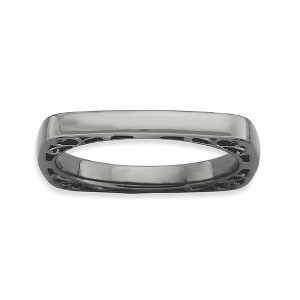 Contemporary geometric style! This 2.5mm square band fashioned from sterling silver features a polished black ruthenium-plated finish, smooth edges with soft rounded corners and open filigree sides. Guaranteed to fit together perfectly with all of the mix and match Stackable Expressions rings. Additional features include: black ruthenium-plated sterling silver band; 2.25mm width, polished finish; round interior, square exterior design; average metal weight is 3.4 grams.