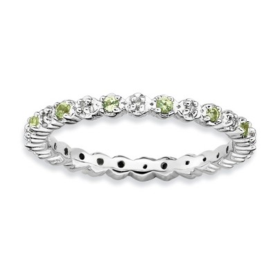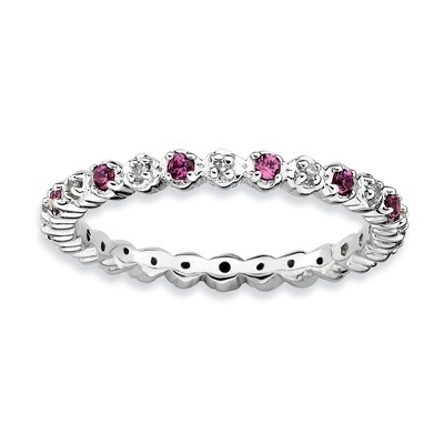 Pink Tourmaline, October's birthstone symbolizes emotional and spiritual love giving the feeling of comfort and safety. Diamonds of course are said to be a girl's best friend. This 2.5mm wide band fashioned from rhodium plated sterling silver is prong set with alternating gemstones all the way around. Guaranteed to fit together perfectly with all of the mix and match Stackable Expressions rings. The color range varies on all natural stones so please allow for slight variations in shades. Additional features include: crafted with rhodium plated sterling silver; genuine pink tourmaline stones, 0.22 cttw; i3 clarity, h-i color diamonds, .04 cttw; average item weight is 2 grams.