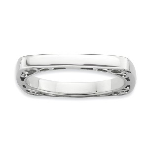 Contemporary geometric style! This 2.5mm square band fashioned from sterling silver features a polished rhodium plated finish, smooth edges with soft rounded corners and open filigree sides. Guaranteed to fit together perfectly with all of the mix and match Stackable Expressions rings. Additional features include: rhodium-plated sterling silver band; 2.25mm width, polished finish; round interior, square exterior design; average metal weight is 3.4 grams.