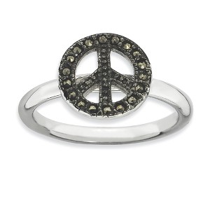 • Unique Features - Fun and whimsical, appealing to all ages and can be worn alone or featured in a collection. This 2.5mm rhodium plated sterling silver band features a 11mm peace sign outlined with sparkling marcasite stones. Guaranteed to fit together perfectly with all of the mix and match Stackable Expressions rings.