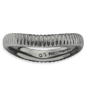 Contemporary geometric style! Create a unique stacked design with curved bands of different colors, patterns and widths. This 3.5mm band fashioned from sterling silver features a polished black ruthenium-plated finish, a gentle wave shape and a grooved pattern. Wear it alone or stack with other curved bands only. Additional features include: black ruthenium-plated sterling silver band; 3.25mm width, polished grooved pattern; designed to stack with other curved bands only; average metal weight is 3.53 grams.