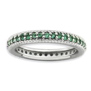 Timeless style! Vibrant 1. Mm created emeralds are prong set in rhodium plated sterling silver all the way around this 3.5mm eternity band finished with a rope edge design. Guaranteed to fit together perfectly with all of the mix and match Stackable Expressions rings. Additional features include: 3.25mm, rhodium-plated sterling silver band; created emerald stones, .49 cttw for size 7; wear it alone or in meaningful combinations; average item weight is 2.84 grams.
