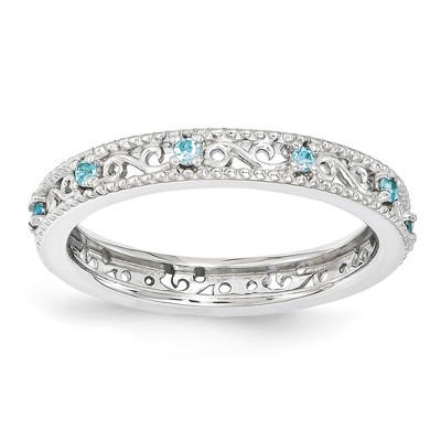 Express your own style with a fresh look for any season by mixing and matching different designs, widths and colors to suit your mood. This 3mm width open back band created from tarnish resistant rhodium plated sterling silver features a scroll design prong set with created ruby stones and a milgrain edge. The synthetic gemstones are 1. Mm in size and the total gemstone weight based on a standard size 7 is 1/5 of a carat. Created rubies like their natural counterparts can range from pink to deep red so please allow for variations in color. Wear it alone or in meaningful combinations, guaranteed to fit together perfectly with all of the mix and match Stackable Expressions rings. Additional features include: rhodium plated sterling silver; created ruby, 1.5mm round, .21 cttw (size 7); band width 3mm, open back; average item weight is 1.84 grams.