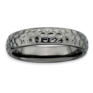 Make it simple and stylish with bands of different textures, finishes, widths and colors! This black ruthenium-plated sterling silver band features a hammered design with a high polished finish that measures 4. Mm wide. Guaranteed to fit together perfectly with all of the mix and match Stackable Expressions rings. Additional features include: black ruthenium-plated sterling silver design; 4.5mm high polished band; wear it alone or stacked in a collection; average metal weight is 3.95 grams.