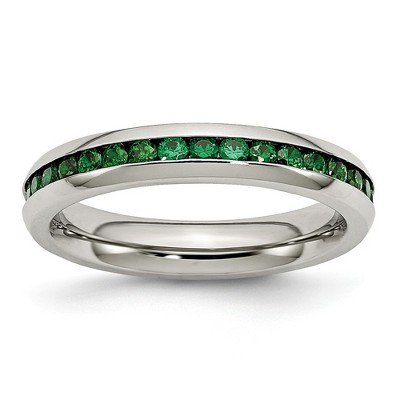 Wear alone or mix with other stack rings to create your own look! This 4mm eternity band fashioned from polished 316L stainless steel is channel set with dark red cubic zirconia gemstones all the way around. Additional features include: polished 316l stainless steel; channel set with dark red cz gemstones; comfort fit, 4mm band; average weight 3.5 grams.