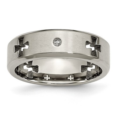 The engraved trinity design, symbolizing eternal love, stands out against the brushed finish on this 6mm width standard fit band. It is made of 316L stainless steel that is silvery gray in color. Suitable for engraving. Additional features include: crafted in stainless steel, brushed & polished finish; standard fit, flat top, engraved trinity symbol design; approximate width 6mm, thickness 2mm; average item weight is 5.34 grams.