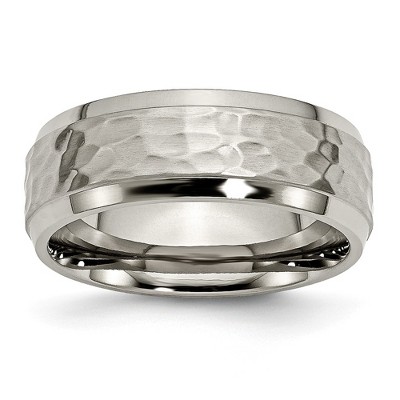 Simply striking, a distinctive style made from cobalt featuring a brushed flat hammered center with grooved and polished edges. This unique standard fit band is approximately 8mm in width and suitable for engraving. Cobalt rings are hypoallergenic, lightweight, shatterproof, and scratch-resistant. Additional features include: crafted in cobalt, brushed & polished finish; shatterproof, scratch-resistant, hypoallergenic; approximate width 7mm, standard fit style; average item weight is 8.26 grams.