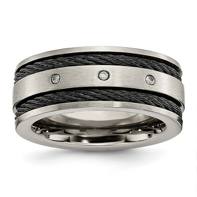 Unique Features - A trendy modern design featuring a flat center inlaid with black carbon fiber, a single bezel-set 2. Mm black cubic zirconia, and polished beveled edges created from durable titanium. This standard-fit band is approximately 8mm in width and is suitable for engraving.