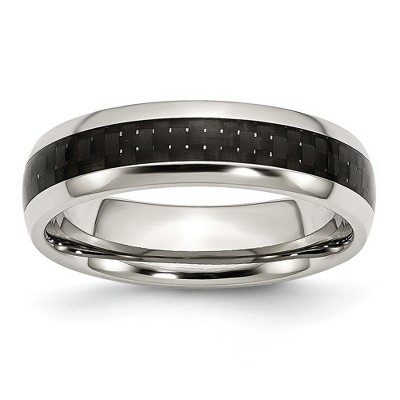 A trendy modern design featuring a recessed center inlaid with black carbon fiber and a rounded edge created from durable titanium. This unique band is 8mm in width, finished with a standard fit interior and is suitable for engraving. Additional features include: titanium & black carbon fiber; standard fit, polished finish; approximate width 8mm, thickness less than 2mm; average item weight is 3.76 grams.