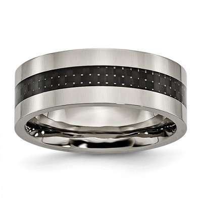 A tried and true favorite style featuring a black carbon fiber inlay and polished edges created from black-plated titanium, a lightweight yet durable metal. The inside of this 9mm width band is rounded for comfort and allows the ring to slide on and off easily. Suitable for engraving. Wide bands fit tighter on the finger, so you might want to consider moving up a size for a more comfortable fit. Additional features include: black plated titanium & black carbon fiber; comfort fit, polished finish; approximate width 9mm, thickness less than 2.5mm; average item weight is 3.74 grams.