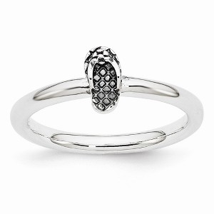 Create a look that is all your own with a fun assortment of rings that looks great alone or stacked in a collection to express your own unique style. This classic style flip-flop ring fashioned from rhodium plated sterling silver features an antiqued 7. Mm textured sandal atop a 2.5mm width band. Guaranteed to fit together perfectly with all of the mix and match Stackable Expressions rings. Additional features include: antiqued rhodium plated sterling silver; approximate flip flop size 7.5mm; band width 2.25mm; average item weight is 2.85 grams.
