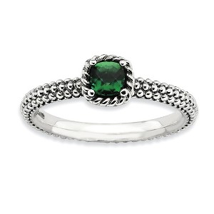 Featured atop a 2.5mm antiqued sterling silver band finished with milgrain detailing is a 4mm checkerboard cut created emerald prong set in a 6mm square rope mounting. Wear it alone or featured in a collection. Guaranteed to fit together perfectly with all of the mix and match Stackable Expressions rings. Additional features include: 2.5mm, antiqued sterling silver band; textured milgrain design; 4mm checkerboard cut created emerald stone, .21 ct; average item weight is 2.6 grams.