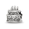 Mark those special occasions in life with one of our many inspiring theme charms designed to tell your personal story. This antiqued sterling silver Happy Birthday charm features a three-dimensional cake design that is approximately 9mm in width by 11mm in length. It has a 4mm core that is interchangeable as well as compatible with Reflections and other popular 3mm width bead style bracelets and necklaces. Additional features include: antiqued sterling silver design; approximate size 9 x 11mm with a 4mm core; fits most 3mm bracelets and necklaces; weight is approximately 2.52 grams.
