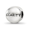 Add a chapter to your bead collection with a theme simulated birthstone charm designed to reveal your personal story. This sterling silver with pearly crystals, cylinder style charm features a heart on the front and CLARITY written in antiqued block letters on the back. It is approximately 11mm in width by 11mm in length and has a 4mm core that is interchangeable as well as compatible with other popular 3mm width bead style bracelets and necklaces. Will not fit Pandora bracelets. Additional features include: sterling silver & crystal design; approximate size 11 x 11mm with a 4mm core; fits most 3mm bracelets and necklaces; weight is approximately 2.47 grams.