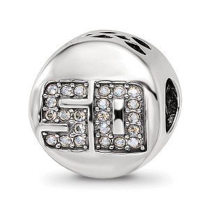 Commemorate a milestone birthday with a prominent number charm made from sterling silver with white crystals! This symbolic double-sided bead features clear crystals highlighting the number 50 on the front and a polished back with Fantastic spelled out in antiqued script. It measures approximately 13mm in width by 13mm in length and has a 4mm core that is interchangeable as well as compatible with other popular 3mm width bead style bracelets and necklaces. Additional features include: sterling silver & crystal design; approximate size 13 x 13mm with a 4mm core; fits most 3mm bracelets and necklaces; weight is approximately 2.79 grams.