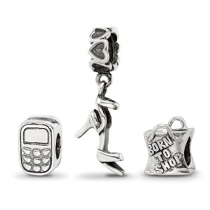 Personalize your bead collection with a set of theme beads designed to reveal your true passion. This antiqued sterling silver 3 charm set includes a 10 x 7mm cell phone, a high heel dangle charm and a 10 x 8mm born to shop bag. All three charms feature a 4mm bead hole that is interchangeable as well as compatible with Reflections and other popular 3mm width bead style bracelets and necklaces. Additional features include: antiqued sterling silver designs; set of 3 themed charms; bead holes measure 4mm in diameter; fits most 3mm bracelets and necklaces.