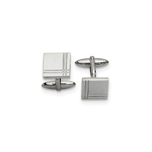 Refine your subtle style with these polished stainless steel cuff links featuring a double grooved edge design that is suitable for engraving and a bullet back closure. The flat tops are approximately 15mm (9/16 inch) in width by 13mm (1/2 inch) in length. Additional features include: polished stainless steel design; approximate size 15 x 13mm (9/16 x 1/2 inch); suitable for engraving; weight is approximately 12.57 grams.