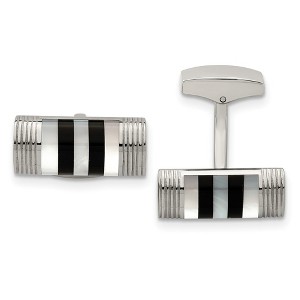 Classic elegance, perfect for every occasion! These stainless-steel rectangular cuff links feature a white mother-of-pearl and black onyx striped design with a whale back toggle clasp. They are approximately 21mm (13/16 inch) in width by 9mm (3/8 inch) in length. Please allow for natural variations in shell color. Not suitable for engraving. Additional features include: stainless steel, mother of pearl & black onyx; features a grooved and striped design; approximate size is 21mm w x 9mm l; average weight for the pair is 15.77 grams.