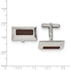 Earthy masculine style featuring a polished stainless steel pyramid design with a wood inlay center and a bullet back closure. These contemporary cuff links are approximately 12mm (7/16 inch) in width by 23mm (7/8 inch) in length. Additional features include: crafted with stainless steel and wood inlay; polished finish; approximate size 12 x 23mm (7/16 x 7/8 inch); weight is approximately 13.88 grams.