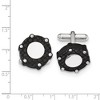 Look your best with these dynamic cuff links rendered in polished and brushed stainless steel with black carbon fiber. The round top measures approximately 20mm (3/4 inch) in diameter and is finished with a bullet back closure. Additional features include: polished and brushed stainless steel, bullet back style; beaded & black carbon fiber design; approximate size 20mm (3/4 inch); average weight for the pair is 6.15 grams.